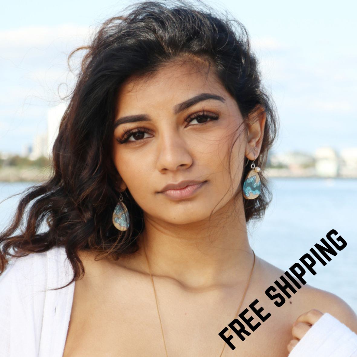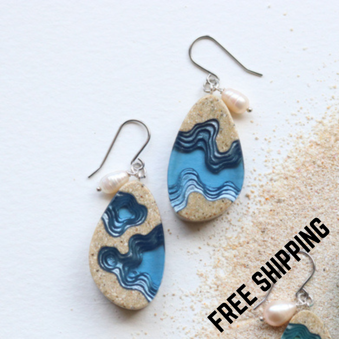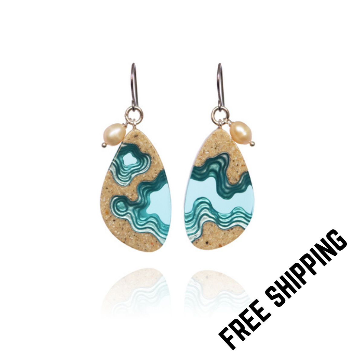 The Rockpool earrings are the largest earrings from our Aqua collection and ideal for those who love to turn eyes with unique statement earrings. They feature an asymmetrical tear drop shape and have been crafted from bonded beach sand, aquamarine blue resin and silver metal pigments covering the delicate topographic layers of the earrings. Each earring features a delicate freshwater pearl with a beautiful slightly peach pink luster.