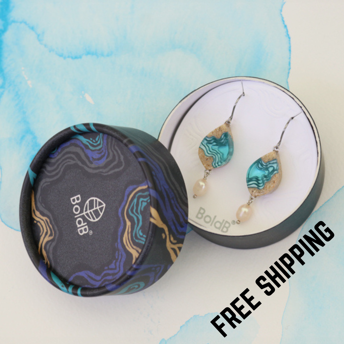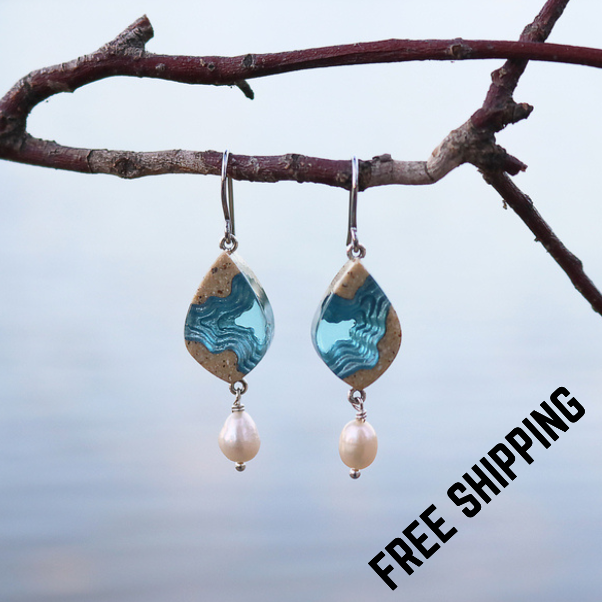 Our Bay earrings feature a delicate leaf shape and have been crafted from bonded sand, aquamarine or ultramarine blue resin and silver metal pigments covering the fine topographic layers of the earrings. An elegant freshwater pearl with a slightly peachy/pink luster dangles below each earring to complement the design. Small eye-pins connect each earring to an allergy-friendly stainless steel french hook.