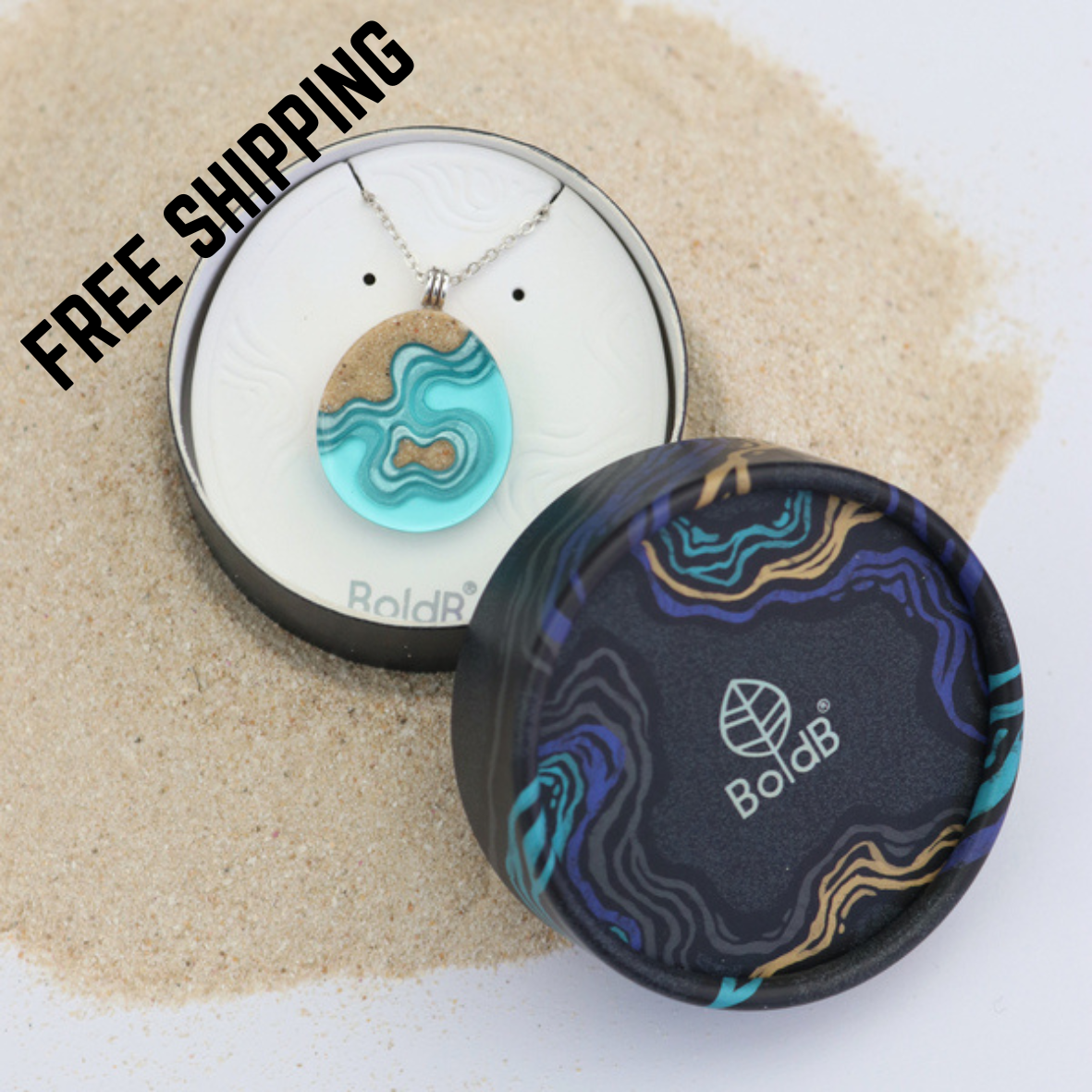 Our Promontory necklace showcases a wide tear drop shaped design, with layers that mimic the topography of a Promontory pertruding into the ocean. The necklace is carefully crafted from bonded beach sand and blue resin and dangles on an 20”/50cm cable link chain with a 2”/5cm extender.