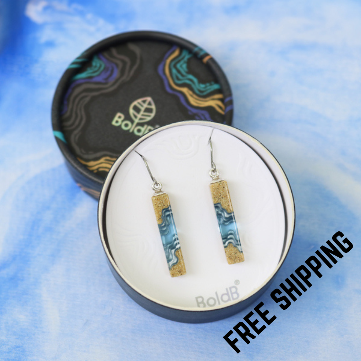 Our Strait earrings showcase a minimalist, elongated rectangle shape. Crafted from bonded sand and blue resin, the design is inspired by a narrow strait that separates two land masses. Each earring hangs gracefully from an allergy-friendly stainless steel French ear hook."